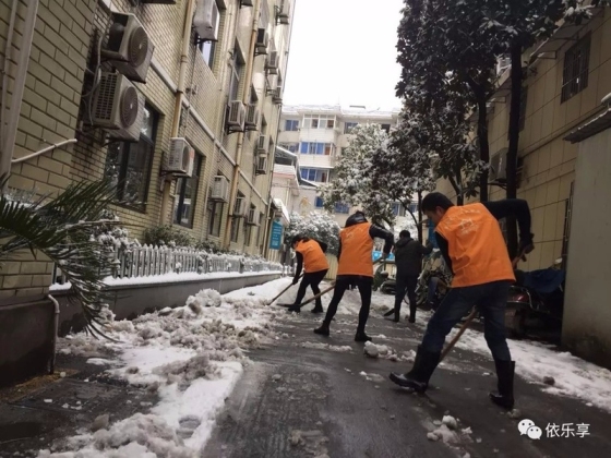 2018年的第一场雪,在大家的各种期盼声中,终于来了。 一夜的大雪,屋顶上、路上、草地上都铺满了厚厚的一层,这可把熊孩子们高兴坏了,但是也给大家的出行带来了不便。 26日一大早, 居家乐义工服务队组织到中医院开展积雪清扫活动。 义工们自带工具,不畏严寒,大家分工合作,配合默契,干劲十足,挥舞着除雪工具,雪水浸入鞋里,眼镜片蒙了一层薄雾,然而这一切丝毫没有影响大家高涨的扫雪热情。 经过几个小时的劳动,路面就被打扫干净,最后往路上铺上了红地毯,起到一个防滑的作用,为进出的病人及病人家属们创造了安全的